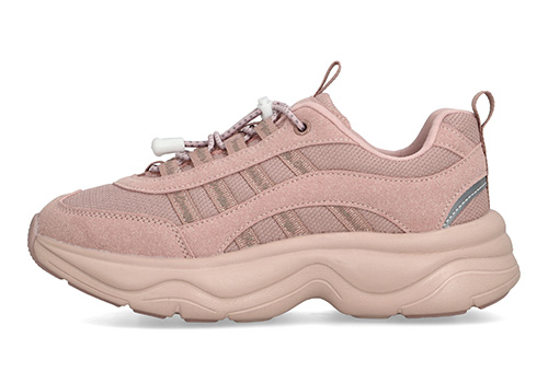 見た目はインパクトのあるボリュームデザインながら、実際のヒール高は歩きやすさを考えた安心の設計。着脱カンタンなドローコードはキッズに人気のスタイル。