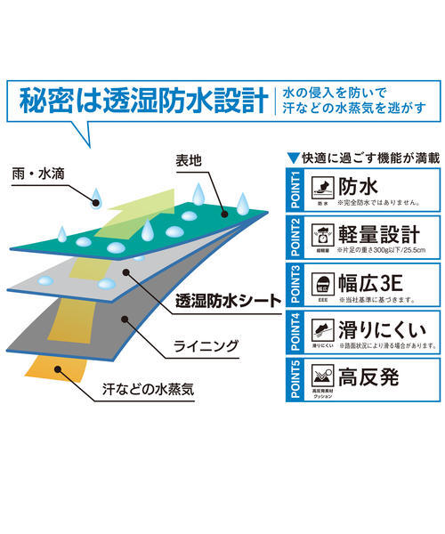 内部に透湿防水シート、縫製部を防水テープで袋状に覆い、水の浸入を防いで汗等の湿気を逃がすワンランク上の防水構造。4cm4時間の浸水試験にクリア(完全防水ではありません)